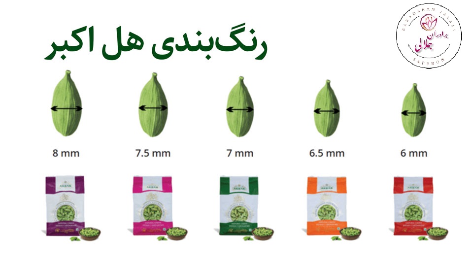 - هل اکبر بنفش: درشتترین سایز هل اکبر با 8 میلیمتر. مخصوصاً برای هل اکبر بنفشرنگ سبز پررنگ هلها بسیار اهمیت دارد و در خرید مشتری نیز بسیار تأثیرگذار است.